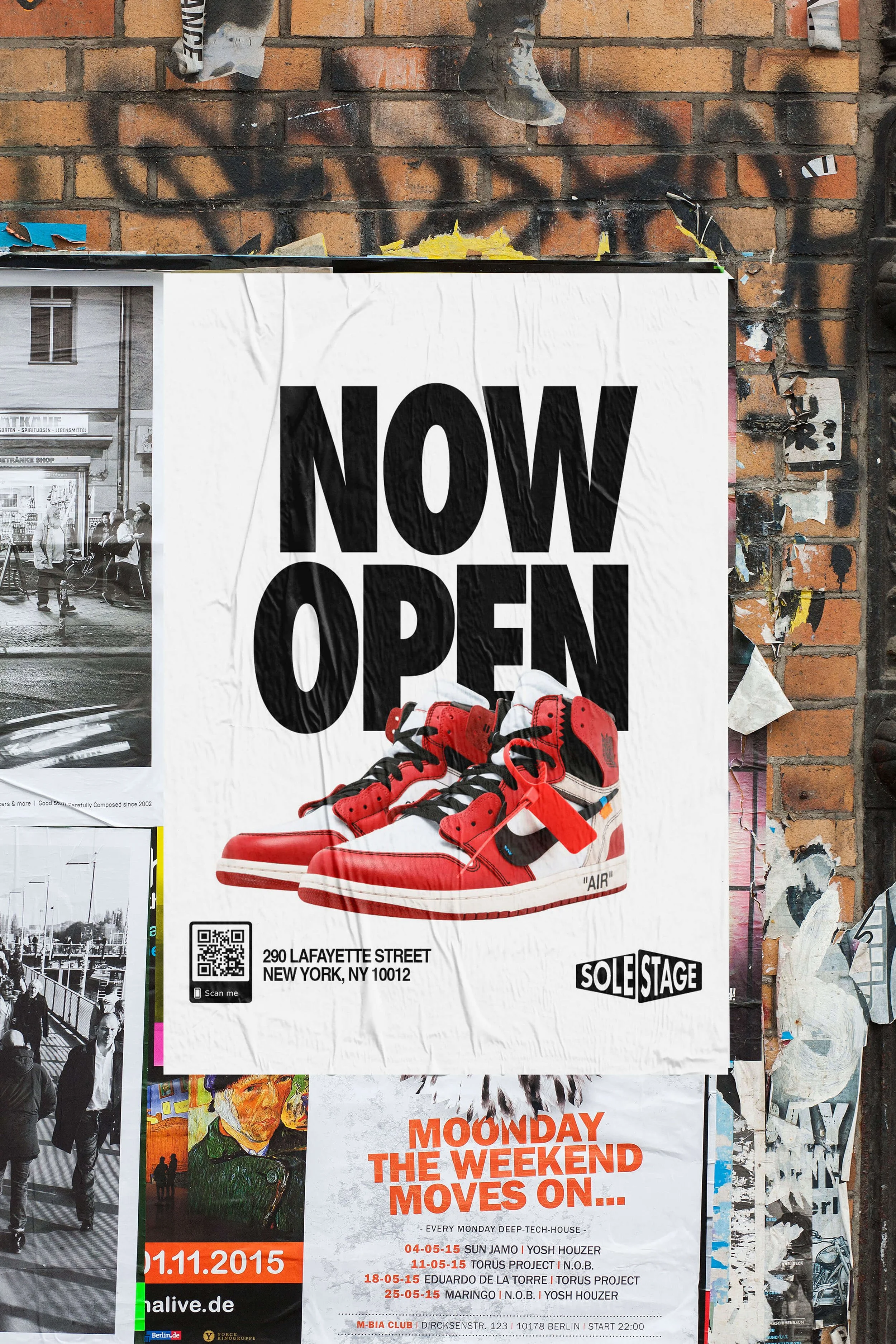 For the grand opening of Sole Stage NYC, I created a full suite of promotional materials; including posters, wheat pastes, and flyers, that captured the brandโs swaggy vibe and sneaker-culture roots. Each piece was inspired by the Nike SNKRS app, crafting a familiar visual that would stand out with sneaker-heads across the cityโs visual landscape and build anticipation ahead of opening day.